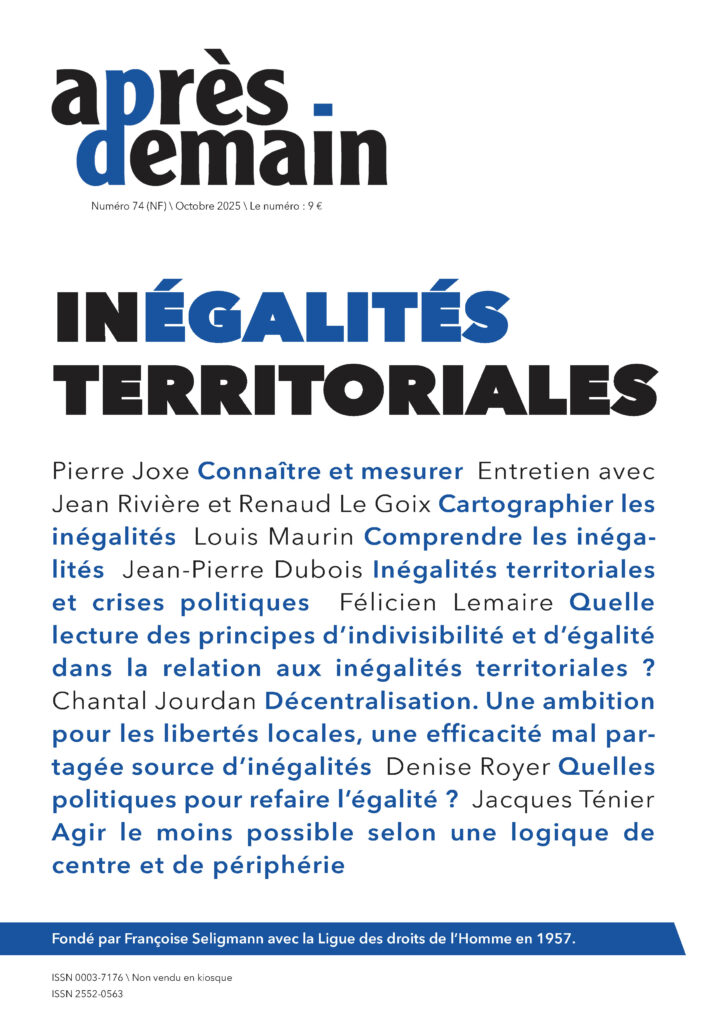 Le n° 74 NF d’Après-demain explore la question des inégalités territoriales, sous l’angle de la géographie sociale, de la politique, du droit ou encore de l’administration. Il comprend notamment, outre un éditorial de Pierre Joxe : un entretien, illustré de cartes inédites, avec les géographes Jean Rivière et Renaud Le Goix, autour de l’Atlas social de la France qu’ils publient avec plusieurs auteur·ices en sciences sociales ; des contributions de Louis Maurin, Jean-Pierre Dubois, Félicien Lemaire, Chantal Jourdan, Denise Royer, Jacques Ténier.