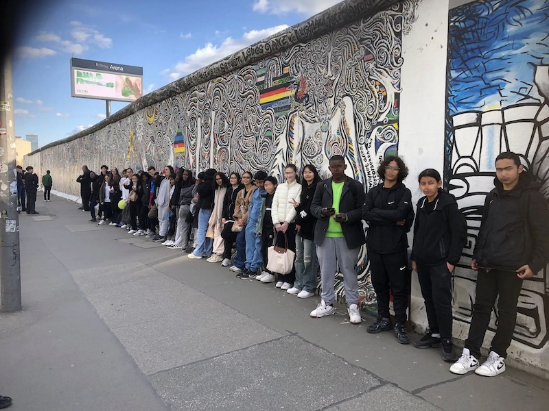 Proposé à tous les élèves germanistes des niveaux 4e et 3e de l’établissement ayant suivi un enseignement de l’allemand depuis la classe de 6e (section bilangue) ou 5e (allemand LV2), cette action a donné lieu à un séjour à Berlin, du 6 au 11 avril 2025, comprenant une découverte du centre historique, chaque site donnant lieu à un exposé en allemand, anglais et français réalisé par des groupes de deux à trois élèves, à une matinée consacrée aux lieux de mémoire du mur de Berlin, à une visite guidée du camp de concentration de Sachsenhausen, à une visite libre de la Gemäldegalerie et à un itinéraire pédestre passant par l’exposition Topographie de la Terreur, Checkpoint Charlie et le Mémorial des Juifs d’Europe assassinés.
